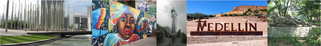 Image banner (left to right) courtesy of: Alonso Cárdenas – Medellín Parque de Luz, Bernard Gagnon – Graffiti in Comuna 13, Medellín, Hey ho, let’s go – Fuente de la Universidad de Antioquia, Zarateman – Medellín, un viaje en el tiempo 2, SajoR – Madre Monte obra de Jose Horacio Betancur
