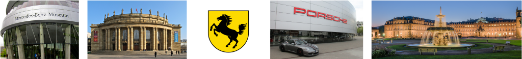 Image banner from left to right courtesy of Ank Kumar, Mercedes Benz Museum; Schlaier, Stuttgart Staatstheater; Coat of arms of Stuttgart; Arnaud 25, Porsche Museum; Julian Herzog, Neues Schloss Schlossplatzspringbrunnen Schlossplatz Stuttgart.